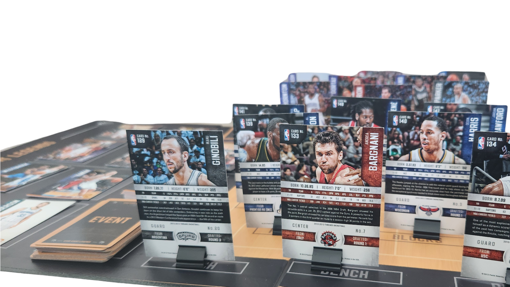 In this game of table-top fantasy sports, you will take on the role of an NBA General Manager in hopes of building a winning playoff team.It is your responsibility to build a strong “market” of players outside of the game by collecting a 60-player deck. This is the deck of trading cards you will use in the game. During the game, you draft players to your team and strategically use their skills, based on historical stats, to beat your rival GM in a playoff series.